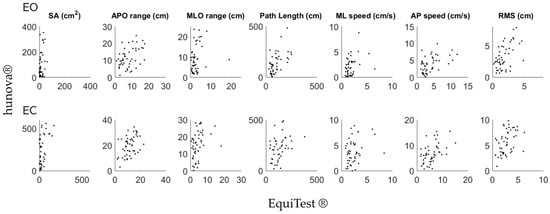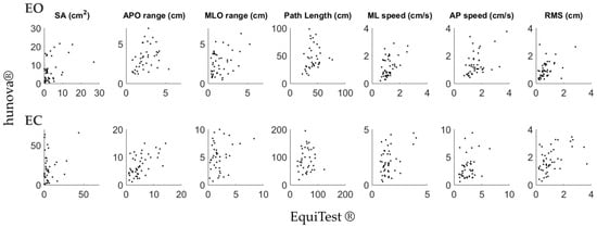 Table 1 presents mean values and relative standard deviations for each parameter computed for both EquiTest® and hunova®, as well as the results of the correlation analysis on static balance data (See Figure 4 for a graphical representation of results). All correlations were significantly strong and relatively strong for both EO and EC conditions; only the APO range with EO was moderate. Findings confirmed previous results from [].