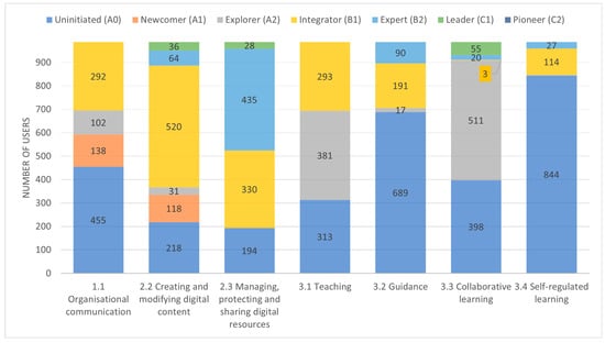 Each row in Table 3 displays the different competency levels defined by the DigCompEdu framework. An additional level, Uninitiated (A0), was added to represent all those educators who have not been able to demonstrate minimum competency level based on their interaction with the LMS and the records left in the analyzed system logs.