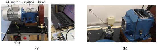 The experimental test rig comprises a three-phase AC motor, a variable frequency drive (VFD) as a motor speed regulator, a speed reducer gearbox, and a dry friction brake, along with the acquisition system (Figure 1a).