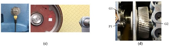 (a) Overview of the test rig and acquisition system; (b) input shaft with pinion P1 and two bearings; reducer top cover is removed; (c) triaxial accelerometer and tachometer (pointing to the friction disc); (d) top view of reducer with top cover removed.