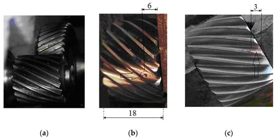 Typical defects on gears include adhesive wear, micro-pitting, pitting, chipping, scuffing, spalling, cracking, tooth breaking, and white structure flaking [,]. Most gearbox problems are found to be caused by these. Certain defects, such as micro-pitting and pitting due to Hertzian fatigue, wear, scuffing, and scoring, are linked to issues with lubrication. Non-lubrication-related failures include plastic flow, tooth fractures (due to overloading), and root fillet cracks caused by bending fatigue at the tooth root [].