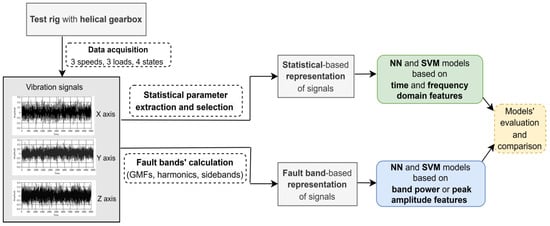 Raw vibration signals, measured using a triaxial accelerometer for three different working speeds and three load levels for each speed, were used to detect the condition states of the gearbox. Statistical-based representations and fault band-based representations of vibration signals were proposed as input to the SVM and NN classification models.