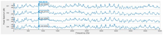 In the power spectrum associated with each analyzing record (csv file), for the first gear pair (p1), the fundamental pinion shaft frequency (), the fundamental gear mesh frequency (GMF), and its harmonics can be considered regular gear pair components. One can add to this group the first-order pair of modulation sidebands, which are generally due to the run-out of the gear because of machining or assembly inaccuracies. A sample logarithmic scale power spectrum for each class (D1, D2, D3, and D4), on the Y axis and for v1 rotation speed is shown in Figure 5. The cursor is positioned at the second harmonic of the GMF (855.38 Hz) of the p1 gear pair. The frequency resolution (df) is 1.221 Hz.