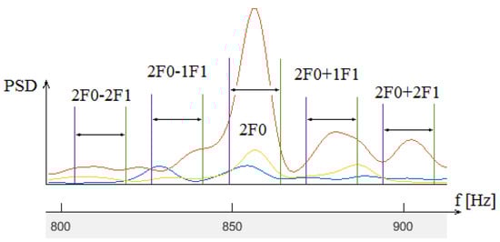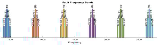 The MATLAB R2023a faultBands function served to derive the frequency bands associated with the GMFs and their sidebands. The input parameters of the function are the fundamental value of the GMF, the number of GMF harmonics, the rotational speed of the pinion P1 shaft, the number of sidebands for each GMF harmonic, and a proposed value for the band width. The fault frequency band width (15 Hz) was selected to cover a larger interval, considering localized defects. All frequency bands are depicted in Figure 6. The frequency is expressed in Hz. For example, 2F0 is the notation of the band with a center frequency equal to 2 × F0, where F0 is × ( can be v1, v2, or v3), while 2F0+2F1 is the notation of a sideband with a center frequency equal to 2 × F0 + 2 × F1, where F1 is .