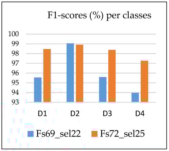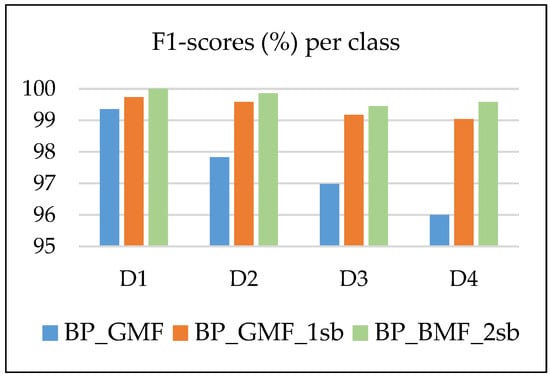 Figure 11 comparatively shows the F1-scores per class from Table 9, Table 10 and Table 11. We notice important classification improvements for the classes D4 (3%), D3 (2.15%), and D2 (1.76%) by adding as features the band powers corresponding to the first pair of sidebands for each harmonic. By using the band powers of the second pair of sidebands for each harmonic as additional features, the F1-scores increase by at most 0.5% (with the greatest value observed for D4). In all three feature spaces, the best detectable class is D1, followed by D2, and then D3 and D4.