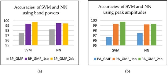 Accuracies achieved by SVM and NN using (a) band powers and (b) peak amplitudes.