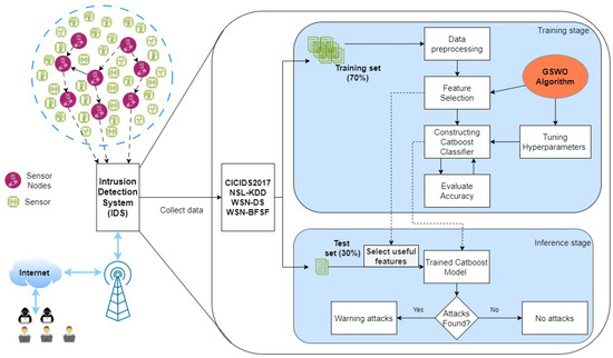 An intrusion is defined as a malicious activity that gains network access and implements unauthorized tasks. IDSs’ role is to secure networks by detecting malicious and unauthorized activities. Figure 1 describes the proposed IDS in WSNs and the overall procedure inside it from the training stage to the testing stage.