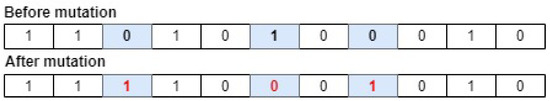The purpose of the mutation operation is to avoid the problem of being trapped in local optima [42]. This process facilitated the generation of new individuals by modifying their random characteristics. Binary values are randomly reversed to convert 1s into 0s and vice versa in order to carry it out. For example, as graphically shown in Figure 3, the introduction of a mutation point at the individual’s third, sixth, and eighth positions cause the chromosome to mutate. The bold shows selected genes for mutation and the red color illustrates the new value of genes after mutation.