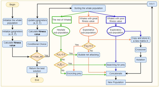 In GSWO, we re-evaluated all individuals in line with their current fitness levels after each iteration. Consequently, the makeup of the individuals in each subpopulation varies constantly with each iteration. Figure 4 shows a schematic diagram of GSWO with the three-population division strategy. Unlike the traditional WOA, in the block “Sorting the whale population”, Equation (12) is employed to divide the whole population into three subpopulations based on the fitness value. Approximately one-third of the individuals (exploratory subpopulation or the blue part) engage in global exploration, including Equations (7) and (8). Another third (exploitative subpopulation or the orange part) engages in local exploitation, including Equation (13), and the other third (hesitant subpopulations or the green part) inherits all traditional WOA traits, including Equation (1). Additionally, the exploratory and exploitative subpopulations implement genetic operators (the branch on the left side) in the next paragraph. After that, four branches are concatenated before calculating the fitness value and conducting the proposed conditional inherited choice. During iterative procedures, this architecture gives GSWO the flexibility to conduct both global and local explorations.