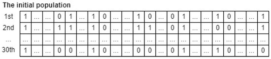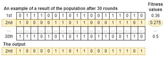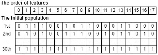To apply the GSWO algorithm to a specific task, defining the total iteration (), the number of crossovers (G), the number of whales in the population (N), and the form of each whale in the population as input and a fitness function as the target for this algorithm is required. The output is the candidate whale with the lowest fitness value. In this section, we apply GSWO for FS. To begin with, the total iteration (), the number of crossovers (G), and the number of feature subsets in the population (N) are considered to be hyperparameters, which vary based on a specific dataset. These hyperparameters must be chosen pertinently to ensure that the GSWO can achieve the most useful feature subset and optimize the computational time. In addition, the form of whales in the input population, a feature subset, is illustrated as binary arrays comprising 0s and 1s. In this representation, a position of a feature marked 0 implies exclusion, whereas a position of another feature marked 1 implies inclusion in the feature subset for calculating fitness value. Therefore, a feature subset in the input population is characterized as a binary array of dimensions D, which is the number of whole features in a specific dataset. For instance, the WSN-DS dataset [46] has eighteen features. Through comprehensive experiments for this dataset, the total iteration (), the number of crossovers (G), and the number of feature subsets in the population (N) are set as 30, 20, and 30, respectively. An initial population that has 30 feature subsets can be depicted in Figure 5. Note that an initial population is initialized randomly because the algorithm will update the feature subsets in the population to find the best subset, including only the useful features, to minimize the fitness function.