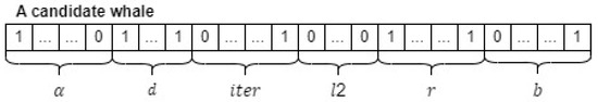 Here, is the position vector of the best whale (a locally optimal solution), while is the position vector of the normal whale at the current iteration. is the updated position vector of the same whale with . The distance between each whale and the search agent is expressed as .