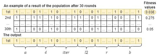 A corresponding calculation formula exists for the fitness value depending on the application. In this study, the fitness value is the false prediction rate of the model classification, so the smallest fitness value is the best.
