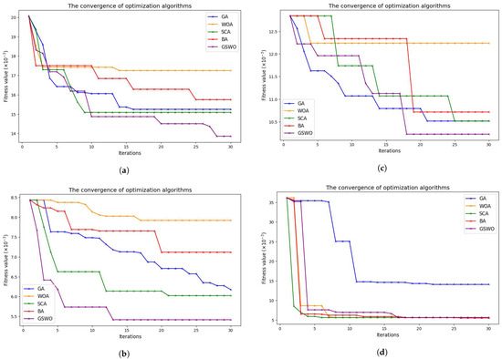 The convergence of algorithms for (a) NSL−KDD, (b) CICIDS2017, (c) WSN−DS, and (d) WSNBFSF.