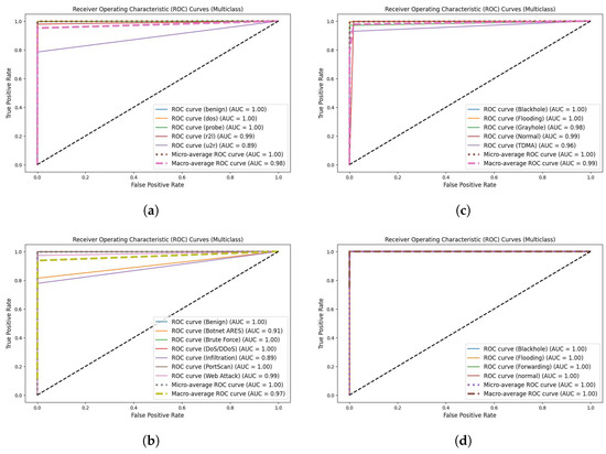 ROC curves for proposed system in (a) NSL-KDD dataset, (b) CICIDS2017 dataset, (c) WSN-DS dataset, and (d) WSNBFSF dataset.