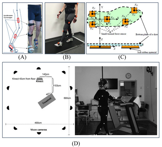 Some examples of pathological gait classification approaches: (A) Accelerometer [4] could be arranged on a patient’s leg to get gait parameters; (B) Force plate method [5] could collect the ground reaction forces to analyse the gait; (C) Fabric sensors [6] could be applied as smart insole to collect the data from the human foot; (D) in [7], 3D Vicon motion capture and Kinect camera are combined for gait analysis.