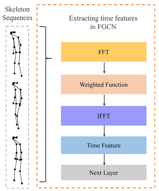 The computation of Time Convolutional Networks (TCNs), detailed in Equation (1), inadequately captures temporal variations and differences. By converting data into the frequency domain using two-dimensional fast Fourier transform (2DFFT) as shown in Equation (3), and weighting the spatial and temporal features based on training weights from graph convolution, the F-GCN offers an enhanced feature representation. This integrated approach allows the model to better discern spatial and temporal patterns, improving its performance in gait analysis. Figure 4 depicts the F-GCN model, highlighting its ability to minimize the noise introduced by human skeleton prediction algorithms and to capture the intrinsic periodicity of human gait. The F-GCN’s consideration of both spatial and temporal characteristics promises a more comprehensive understanding of gait features, beneficial for applications in healthcare and rehabilitation.