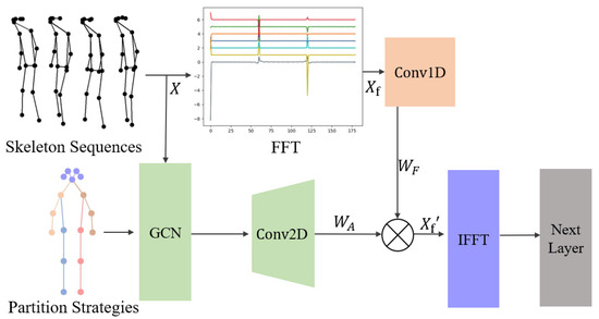 The F-GCN enhances gait analysis by utilizing frequency domain weighting alongside data restoration techniques to optimize the process. This method effectively counters the computational distortions that arise when predicting human skeletal points through algorithms. F-GCN harnesses the intrinsic periodicity of human walking patterns by applying a frequency domain weighting tactic, thus capturing essential gait attributes with high precision. In addition, the network incorporates spatial data by preserving the original spatial characteristics within the frequency domain weighting phase. F-GCN’s integrated approach ensures a comprehensive feature representation, which embraces both the frequency and spatial dimensions, culminating in improved gait analysis performance.The detailed structure of the F-GCN is shown as Figure 5.