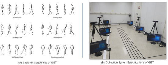 As shown in Figure 7, the GIST dataset comprises 6 gait pathologies from 10 subjects, with 120 frames per subject. This translates to a total of 7200 subjects captured by 6 Kinect V2 RGB-D cameras from 6 different viewpoints. For each subject, 25 skeleton points are extracted from the body using the Microsoft SDK, including the x, y, and z coordinates of each point. The captured gait sequences are classified into 6 categories: Normal, Stiff, Antalgic, Lurching (Wadding), Steppage, and Trendelenburg.