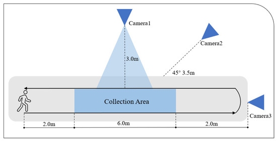 Illustration of data and the collection methods of our Dataset in hospital. Camera 1 videos side-view images from 3 m, Camera 2 captured oblique side-view videos from 3.5 m at a 45-degree angle, and Camera 3 captured frontal videos. The filming area covered six meters.