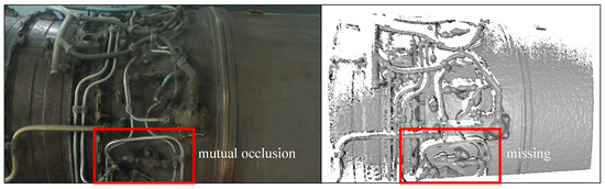 Image (left) and point cloud (right) of aircraft engine pipeline system. It can be seen that there are occlusions and data missing in the point cloud, which pose challenges for point cloud registration.