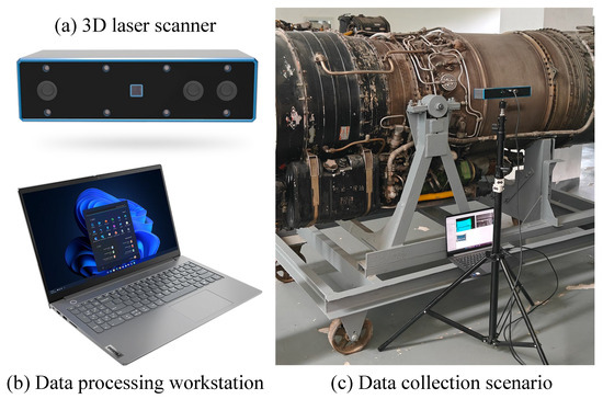 In our hardware setup, the 3D scanner is mounted on a support structure consisting of a tripod and a gimbal. The 3D scanner is connected to the workstation and the power supply using two cables. During operation, the 3D scanner captures point clouds of the aircraft engine pipeline system. These point clouds are then transmitted to the workstation for registration and analysis. After each data acquisition is completed, the tripod is manually repositioned to the next station until the entire surface of the pipeline system is covered by the 3D scanner. It is important to note that the raw scanned point cloud data obtained from the 3D scanner is in the scanner’s coordinate system. Therefore, we employ our proposed method to automatically transform the data into a global coordinate system.