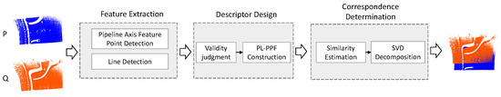 The method takes the raw scan data obtained from the 3D scanning laser, which contain the pipeline features, as input. Our goal is to register the raw scan pipeline point clouds, consisting of repetitive and incomplete structures, into a global point cloud. Figure 3 provides an overview of the proposed framework, which consists of feature extraction, feature descriptor construction, and similarity matching.