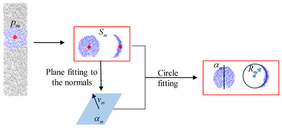 Illustration of pipeline feature detection. First, a point is randomly selected from the 3D point cloud. Next, we extract a patch from the point cloud P, and the normals of the points within this patch are projected onto a Gaussian sphere, resulting in a normal vector . and can determine a plane. Then, is projected onto this plane, and a circle is fitted with as the center and as the radius.