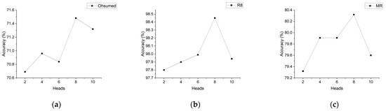 Comparison of classification accuracy of models with different head sizes for dataset: (a) Ohsumed, (b) R8, and (c) MR.