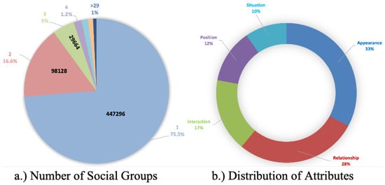 The accompanying pie chart in Figure 3b delves into the complexity of attributes in our dataset, revealing that “Appearance” consists of 33% of the total annotations, which is the highest, “Relationship” consists of 28%, “Interaction” consists of 17%, “Position“ consists of 12%, and “Situation” consists of 10%, which is the least. We explore the distribution of social activity labels in Figure 3a, focusing on the sizes of social groups. The chart in the figure provides a nuanced view of social group sizes in the dataset. Specifically, 75.5%, 16.6%, 5%, and 1.2% of social groups consist of one, two, three, and four members, respectively. Interestingly, only 1% of the dataset includes groups with five or more members, with the maximum observed group size being 29 members.