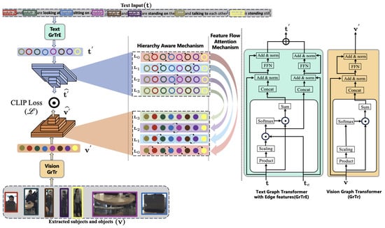 Overall architecture of the proposed HAtt-Flow network. The extracted visual and textual features are passed through their respective graph transformers to obtain corresponding node features. These nodes are passed through the hierarchy-aware-based transformer encoder models to have enriched features, including a feature flow–attention mechanism to enhance cross-modality learning. Finally, we use CLIP loss to optimize the learned features. Please refer to Figure 1 for the details of levels , , , and .