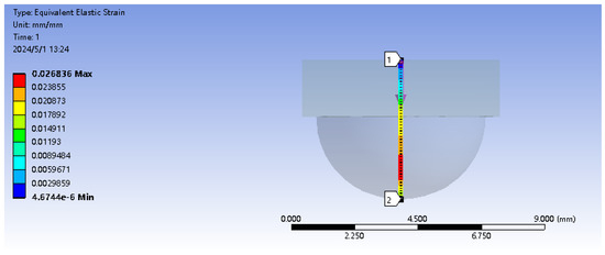 Encapsulating fiber Bragg grating sensors with packaging material aims to enhance protection and sensitivity. This approach effectively safeguards the fragile nature of fiber Bragg gratings while also boosting sensor responsiveness. The sensor unit is encapsulated using elastic 50 A resin material with the upper substrate designed in a “hemisphere” structure. Initially, in SolidWorks, the upper hemisphere structure with dimensions of R = 3 mm and the lower rectangular prism measuring are created. The combined elastic body model is imported into ANSYS to conduct finite element analysis using ANSYS Workbench, aiming to determine the optimal embedding depth of the elastic body under loading conditions. Firstly, the elastomeric model is established in Geometry, and in the material data, the density of the matrix model is set at 1000 Kg/m3, the elastic modulus is 9.2 MPa, and the Poisson’s ratio is 0.49. At the center point of the base model, a vertical path is set, while horizontal paths are set at the half of the hemisphere and at the interface between the hemisphere and the lower base. A vertical downward concentrated force of 2 N is applied to the center point of the upper surface of the hemispherical matrix, and a fixed support is added to the lower surface of the cuboid matrix. The simulation results show that the response of the vertical path under the action of vertical force is shown in Figure 2. When 2 N force is applied to the side of the hemisphere, the simulation results show that the response of the vertical path under the action of lateral force, as shown in Figure 3. The stress position and direction of the specific structure are shown in Figure 4.