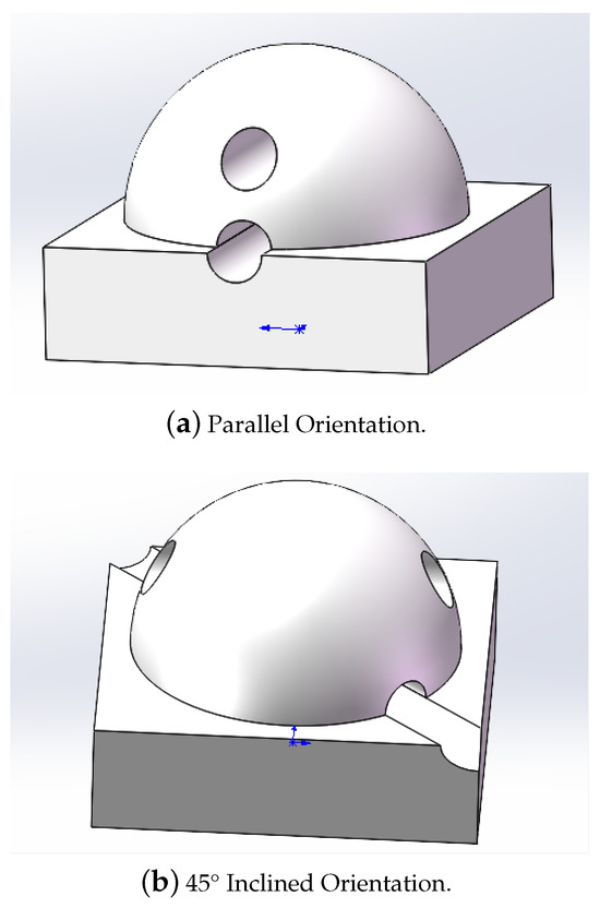 From Figure 2, it can be observed that under a force of 2 N, the depth of embedding is 1.5 mm from the vertex of the hemisphere where the overall strain mean value is maximum. From Figure 3, it is evident that under a lateral force of 2 N, the depth of embedding is at the interface between the hemisphere and the cuboid, where the overall strain mean value is maximum. In conclusion, to achieve a real-time and accurate perception of tactile and sliding information from the sensor while avoiding distortion of the grating wavelength due to cross-contact between multiple FBGs, a dual-layer “hemisphere-cuboid” distributed FBG sensing structure is designed with two FBGs embedded separately within the sensor. Based on simulation results, the embedding depths are determined to be halfway into the hemisphere and at the interface between the hemisphere and the cuboid. The sensor structure is illustrated in Figure 5.