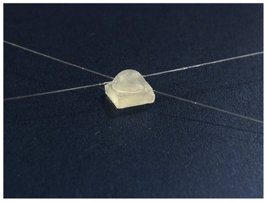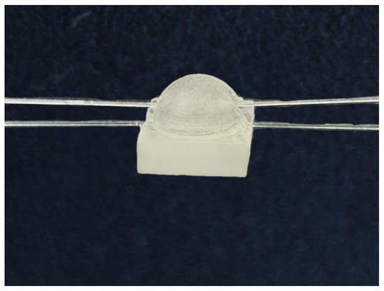 Based on the results of simulation analysis and the optimization of the sensor array structure design, a 2 mm FBG was selected as the sensing element in the upper layer structure with its embedding depth determined to be 1.5 mm from the top of the hemisphere. In the lower layer structure, 2 mm and 3 mm FBGs were chosen as sensing elements with the packaging positions set at 0° and 45° angles inclined from the baseline, which are located at the interface between the hemisphere and the cuboid. The fully packaged fiber optic grating tactile sensor array structure is shown in Figure 6.