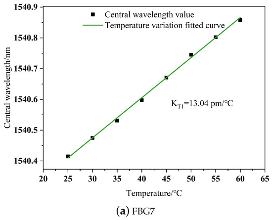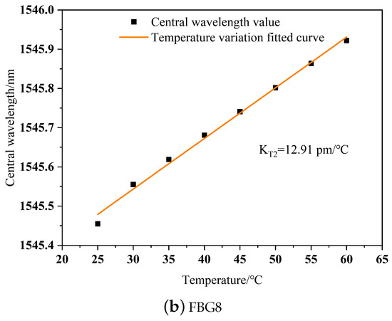As shown in Figure 11, the central wavelength of the FBG changes with temperature. The temperature sensitivities of the polymer-packaged FBGs are = 13.04 pm/°C and = 12.91 pm/°C. Due to the effects of packaging and differences in FBG production processes, the temperature sensitivities of each FBG vary slightly, but all maintain good linearity during temperature variations. It is evident that changes in ambient temperature significantly affect the sensing accuracy of the FBG sensors. Therefore, in this experiment, we maintained a constant indoor temperature.