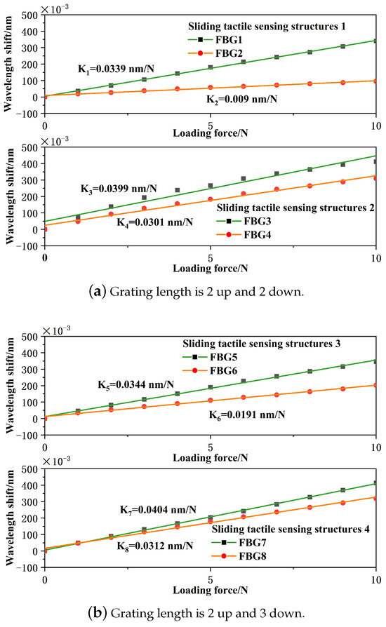 - For sliding tactile sensing structures 1 and 2, as well as structures 3 and 4, under the same grating length but different angles, the sensitivities are as follows: FBG3 > FBG1, FBG4 > FBG2, FBG7 > FBG5, and FBG8 > FBG6. It is evident that when using a sensor structure with an upper and lower base inclination angle of 45°, the sensitivity of the sensor is higher.