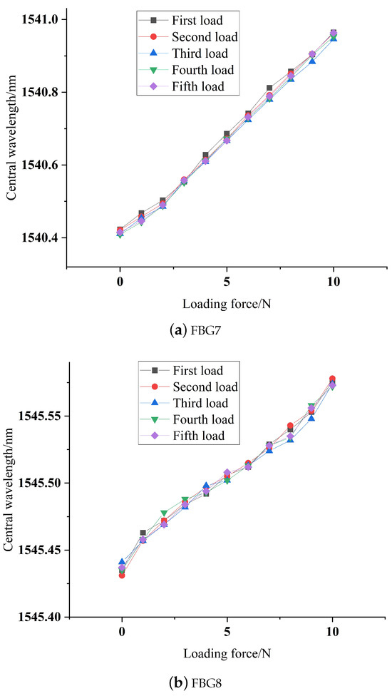 Apply a 0–10 N load to the fabricated array of sliding tactile sensing structure 4, maintain consistent conditions, conduct five repeated experiments, acquire the center wavelength variations of the raised fiber Bragg grating sensors, and illustrate the repeatability curve, as depicted in Figure 13.