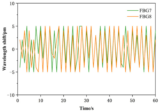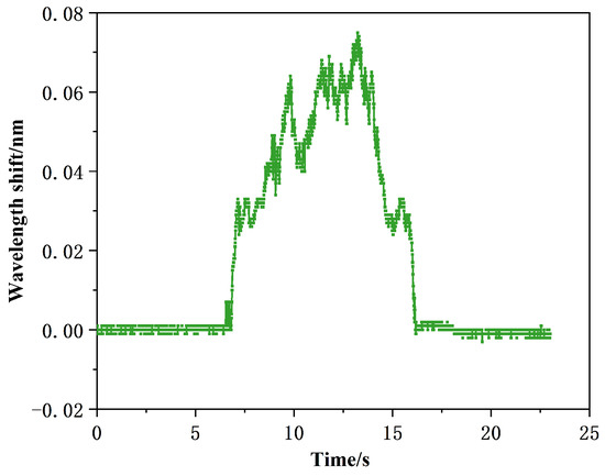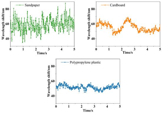 Figure 18 shows the center wavelength variation values of the three materials during the sliding process. From Figure 18, it is evident that different materials result in different wavelength variation values during sliding. When in contact and sliding on sandpaper, the center wavelength offset is ±26 pm; for cardboard, the center wavelength offset is ±12 pm; and for polypropylene plastic, the center wavelength offset is ±7 pm. A higher coefficient of friction at the contact interface leads to a larger offset in the center wavelength with more noticeable fluctuations.