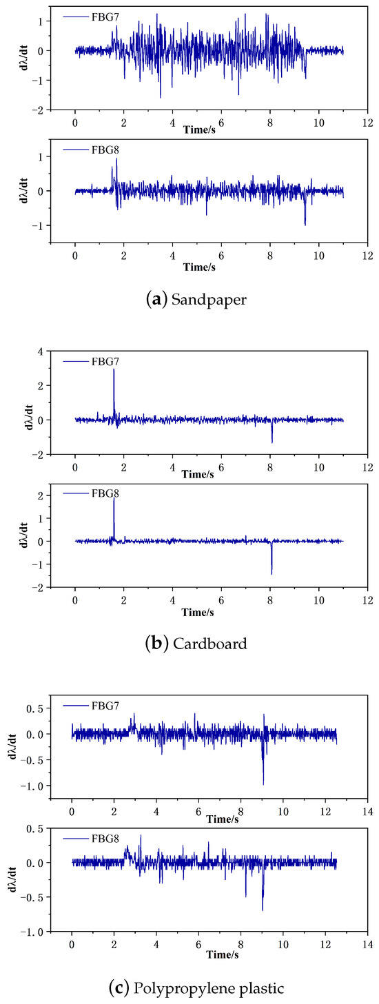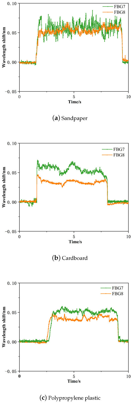Figure 17 illustrates the effect of sliding detection with different sensing materials. As the intelligent-driven small car moves, various parts of the polymer elastomer undergo expansion and contraction, causing corresponding changes in the center wavelength of each fiber Bragg grating embedded inside the encapsulation. Figure 17 demonstrates that the distinct changes in the center wavelength of the fiber Bragg grating can clearly distinguish between the stages of pre-sliding, sliding, and post-sliding. Moreover, the friction varies depending on the sensing material in contact during sliding, leading to different behaviors. Consequently, the center wavelength offset of the fiber Bragg grating during the sliding process when in contact with samples of different material properties can vary. In other words, we can determine the surface material properties being sensed by analyzing the signal of the center wavelength offset during the sliding process.
