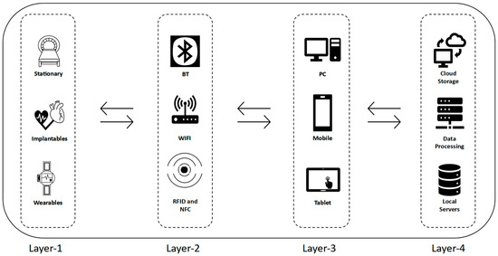- Layer 1: Devices and Instruments Layer, which deploys sensors and actuators to obtain and collect patients’ data. Three main variants are categorized according to their applications and functionality: stationary, wearable, and implantable.