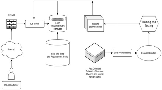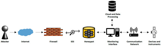 The proposed framework architecture actively detects and mitigates threats as it contains multiple components in terms of security tools that may keep the network safe, such as a firewall [44], an AI-based IDS, and a specific type of IDS called a honeypot [45]. The honeypot mechanism relies on deception and diversion methods for detection and prevention to deflect and reroute the attackers by luring and entrapping them inside a heterogeneous environment that mimics the real network traffic [46]. In addition to providing existing vulnerabilities and exploits inside the simulated environment that entice the attacker by weakened systems to latch on and enable the monitoring and studying of the behavior of the malicious actors by capturing their activities for intelligence gathering and fore-sighting future risks and newly developed cyberattack patterns [47]. This will assist the research and development institutes in creating countermeasures to mitigate the threats without risking the main network environment of the IoMT system’s critical assets. Figure 4 provides a diagram of the suggested IDS technique.
