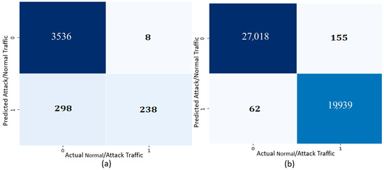 The ensemble method utilized for the IDS was evaluated by multiple parameters and executed by Jupyter Notebook, which is a web-based program for coding purposes. The adaptation of machine learning models with IDS output parameters is provided in Table 3. Figure 6a,b depicts the confusion matrices of the ensemble method for the two datasets.