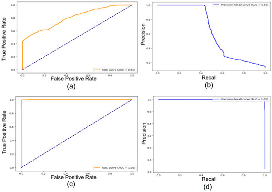 AUC-ROC and AUC-PR evaluate the model’s performance in distinguishing and ranking positive cases. It can be noticed that the model in Dataset 2, being balanced, showed better class separation and true positive identification as compared to the imbalanced model in Dataset 1.