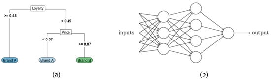 A simple tree machine learning schematic approach based on RF classifier [20] (a), and schematic NN layout (b).