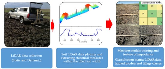 Figure 3 shows the overall schematic of the block diagram for collecting LiDAR data after tillage, processing the LiDAR data set, analyzing it, and training machine models with features important for classifying the LiDAR trained to the three tillage classes.