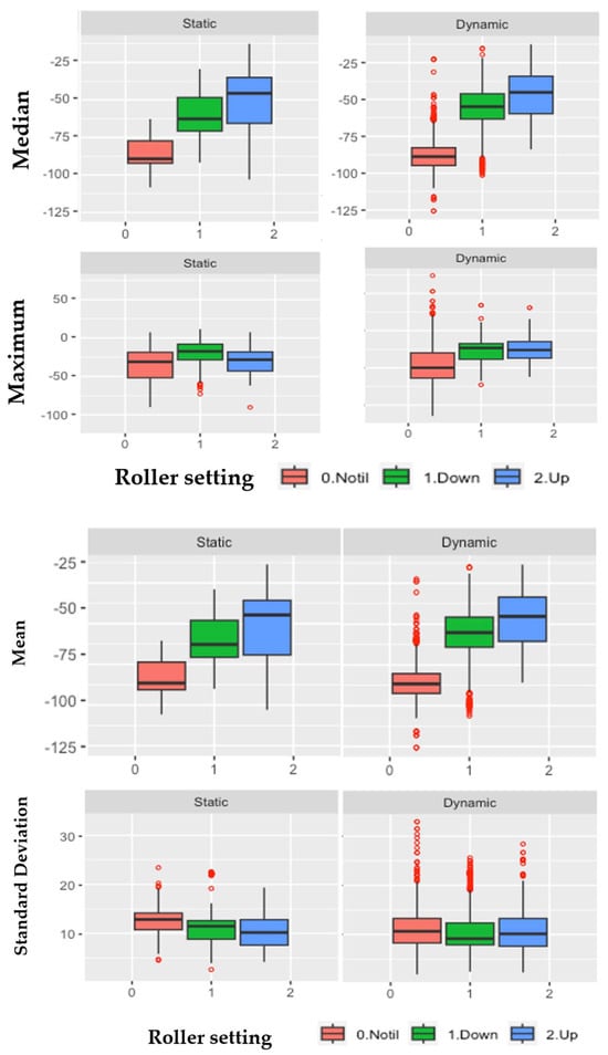Figure 5 shows the box plot of the median, mean, maximum, and standard deviation for the three roller settings (no-till (0), basket down (1) and basket up (2)) from the static and dynamic LiDAR data sets. The trends on the median, 25% quantile (Q2) and 75% quantile (Q3) show decreasing in the absolute soil height with the changing the settings from no-till, roller basket down, and roller basket up, notably from the median, mean and maximum measures. For the dynamic data, there are some outliers; the outliers were detected as values less than the lower fences (Q3 − 2IQR) and greater than the upper fences (Q3 + 2IQR) where Q3 − Q2 is the interquartile range. Q2 is the 25% quantile and Q3 is the 75% quantile.