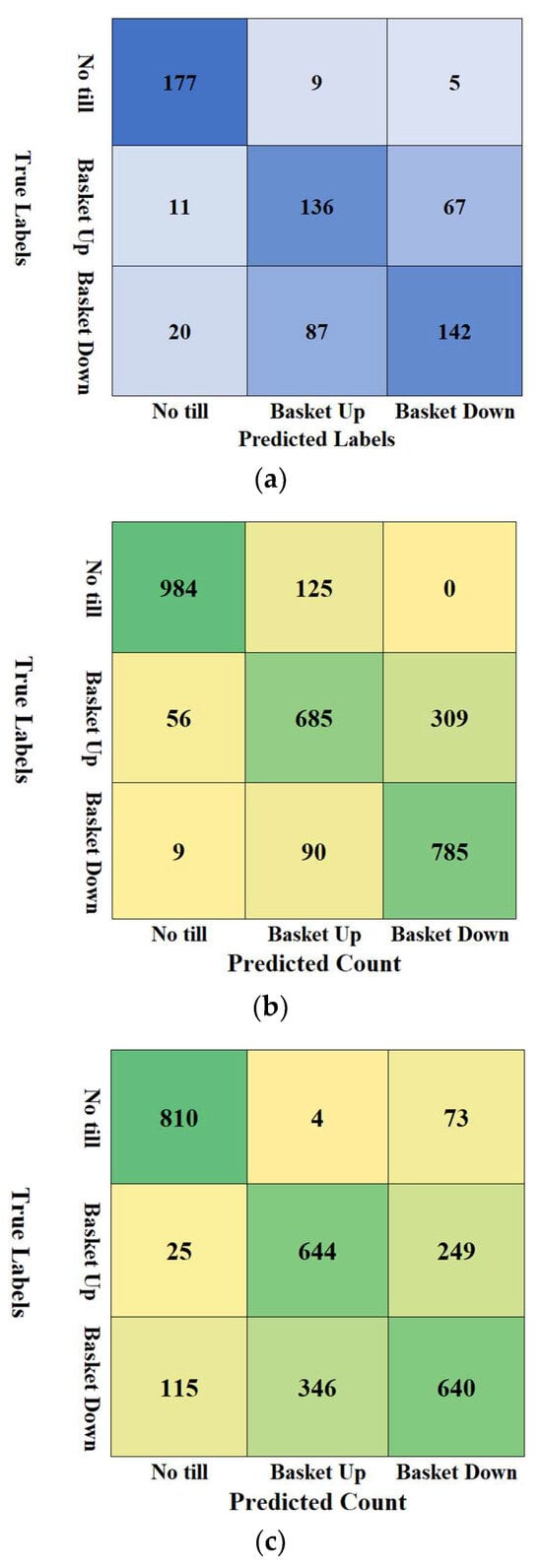 Prediction rate using the discriminatory analysis, comparing the true labels and predicted labels for the three roller settings of (No-till, basket down and basket up) from visible imaging (a), static LiDAR data set (b) and dynamic LiDAR data set (c).