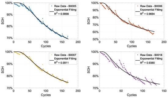 SoH of the batteries tested in the NASA dataset [1]. Each SoH has been fitted with a single exponential model. The value of each fitting is also reported.