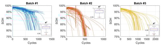 SoH of all batteries in the Toyota dataset [2] divided into three batches. Each subplot shows the value for an exponential model.