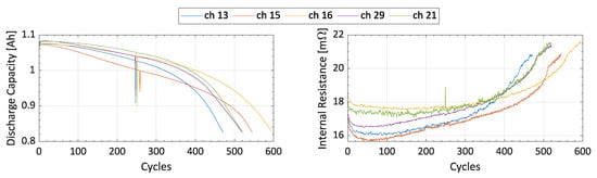 The exponential degradation of discharge capacity and internal resistance is shown in Figure 3, taking as an example five batteries from the Toyota dataset [2] that are randomly selected. For this reason, literature widely discusses describing these phenomena through the application of exponential degradation models. A commonly employed model within this category, as found in numerous recent studies, is the double exponential model [14,36,37,38,39]. The double exponential model strikes a favorable balance between accuracy and complexity, making it a good candidate for an accurate description of the battery degradation. As a matter of fact, examples of application of the double exponential model can be found considering the NASA dataset in [40], the CALCE dataset in [41], and the Toyota dataset in [42]. The most common form of the double exponential degradation model available in literature relies on four parameters, with two (i.e., a and c) representing the internal impedance of the battery, and the other two (i.e., b and d) denoting the aging rate. In essence, the state of health is a k-dependent function (where k is the number of cycles endured by the battery and it stands for a time variable) expressed as follows: