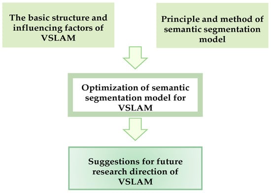 The main objective of this study was to present a comprehensive overview of the development and applications of VSLAM. It summarized and compared the various applications of semantic segmentation in the key components of VSLAM, outlining their roles, benefits, and limitations. Additionally, research gaps in the current literature were identified, and promising future directions in this field were highlighted. The subsequent sections of this paper are structured as follows: Section 2 introduces the fundamental technologies and influential factors in the workflow of traditional VSLAM systems. Section 3 outlines the general principles and classification of mainstream semantic segmentation approaches, with a particular focus on deep learning-based methods. In Section 4, diverse applications of semantic segmentation in the key components of VSLAM are elaborated upon. Finally, Section 5 concludes the paper by summarizing the key findings and discussing potential future research directions. The architecture for this paper is shown in Figure 1.